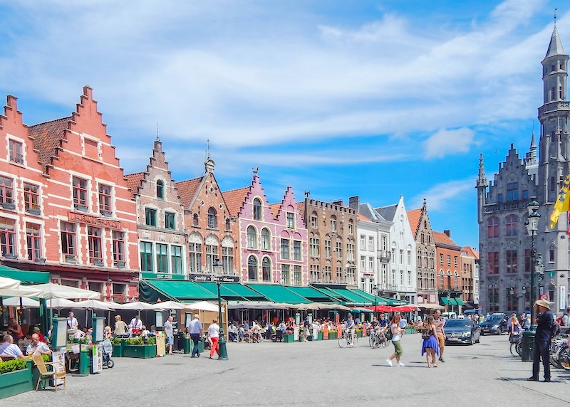 ブルージュの中心にあるマルクト広場は、カラフルなギルドハウスに囲まれた美しい広場です。