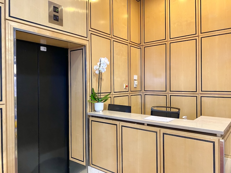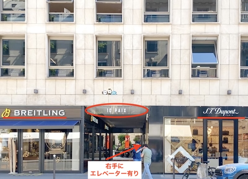 地上階の店舗「Breitling」と「S.T. Dupont」の間の通路を進むと、右手にエレベーターがあります。