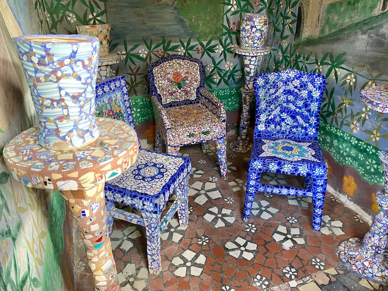 内外の壁はもちろん、天井、床、家具、そして庭に至るまで、ありとあらゆる場所をモザイクで覆い尽くしました。