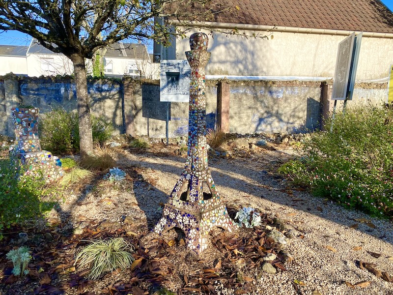1つは彫刻が並ぶ庭で、モザイクの銅像やエッフェル塔が飾られています。