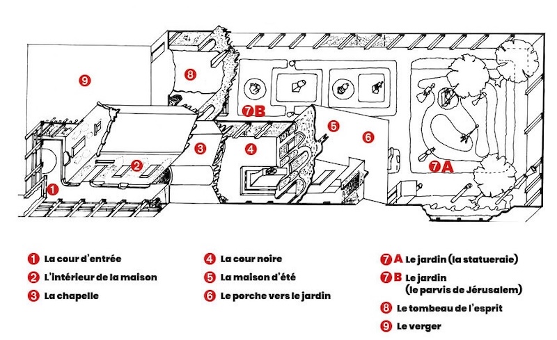 黒い玉座が置かれた中庭で、シャルトル大聖堂を中心に各地の大聖堂や教会が描かれています。